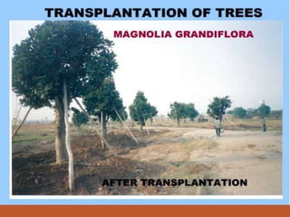 Burlapping, or transplanting trees, is a complex process that involves carefully digging up the root ball and transporting the tree to a new location. It allows for the relocation of trees but recovery is slow. The key steps include selecting trees in good health, digging the root ball in stages, protecting and transporting the root ball, preparing the new planting site, and providing post-transplant care like staking and watering. Factors like tree size, species, and location affect costs, which can be $400-1000 per small tree and higher for large trees. Proper techniques and long-term care are needed to successfully transplant trees and ensure high survival rates.