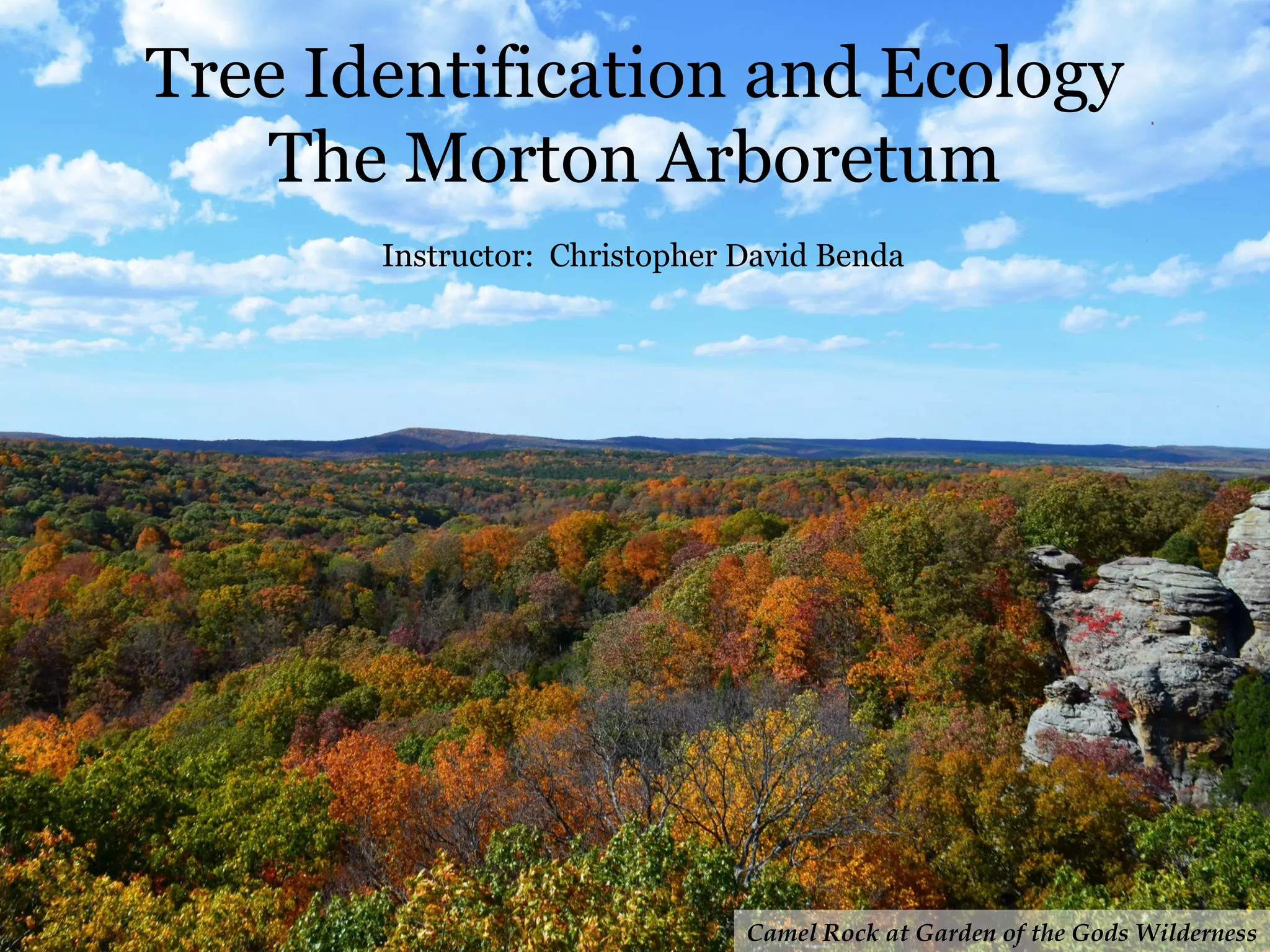This document provides an overview of a tree identification and ecology course taught by Christopher Benda. It includes information about Benda's background and qualifications, as well as an outline of course topics like leaf and flower anatomy, plant taxonomy, dichotomous keys, gymnosperms and common woody angiosperms found in Illinois. The document lists many plant genera and species that will be covered, with a focus on identification and ecological information.