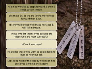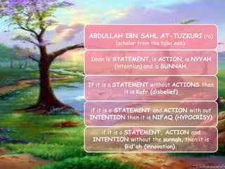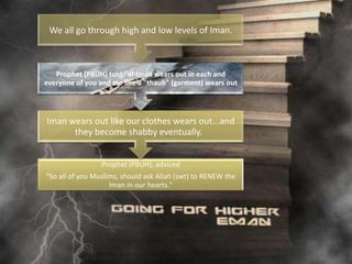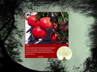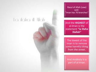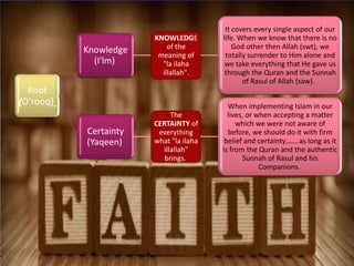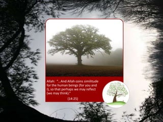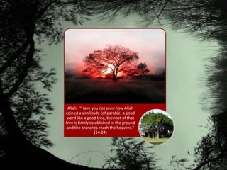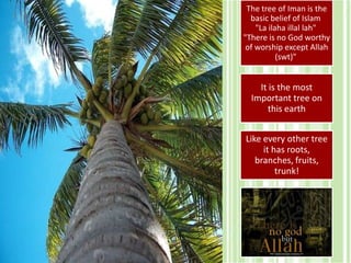 This document discusses nurturing one's "Tree of Iman" or faith. It states the tree has roots of knowledge and certainty, a trunk of purity of intention, and fruits of righteous deeds and noble character. It warns that if one allows sins into their heart, the Tree of Iman can become weak, dry up, and die. It emphasizes the importance of showing faith through both words and good actions.