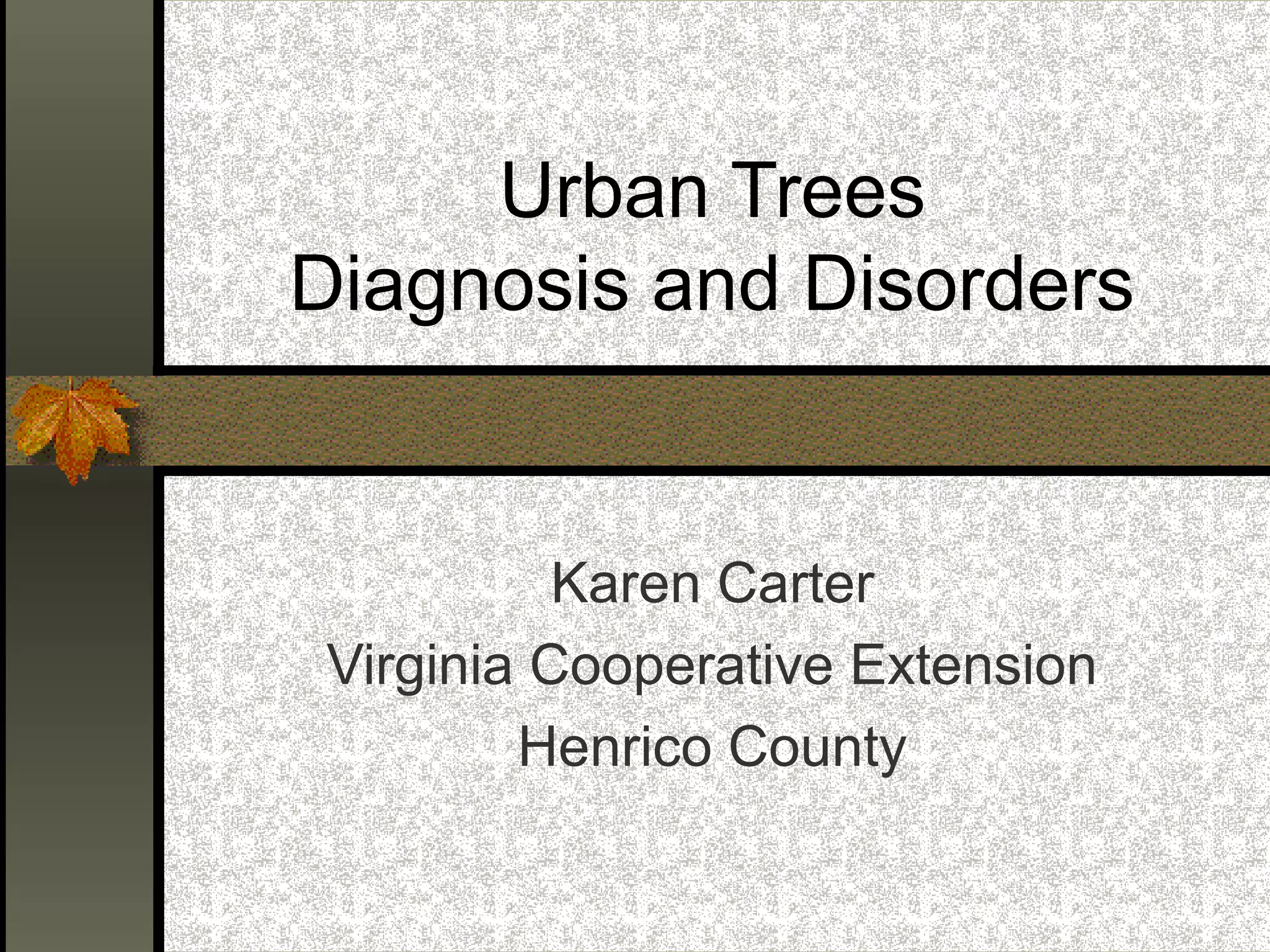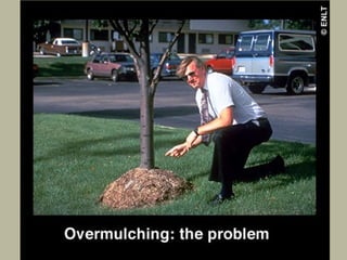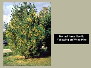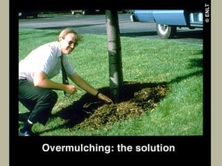 This document discusses common tree diseases and disorders caused by biotic and abiotic agents. It describes symptoms of diseases like powdery mildew, anthracnose, bacterial leaf scorch, and various tree cankers. Signs and conditions favorable for disease development are explained. The role of stress factors in predisposing trees to disease is also covered. The document provides guidance on diagnosing tree problems and submitting samples for analysis. Common urban tree insects like bark beetles, borers, caterpillars, and sucking insects are also outlined.