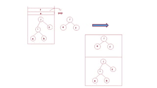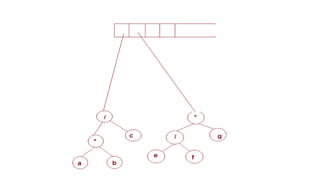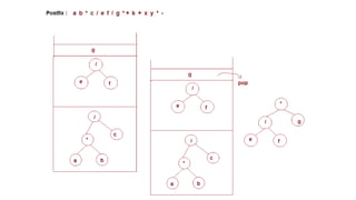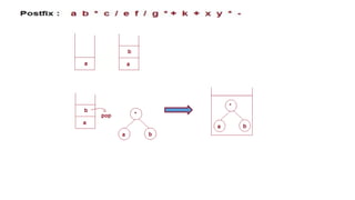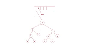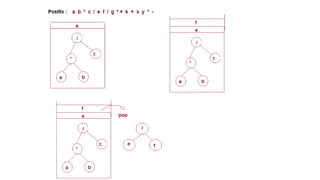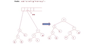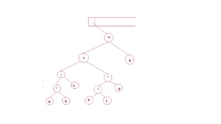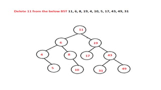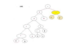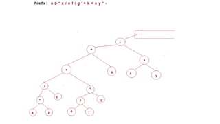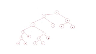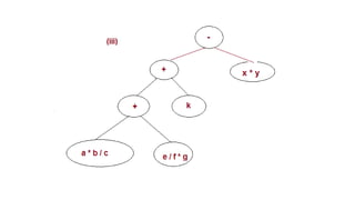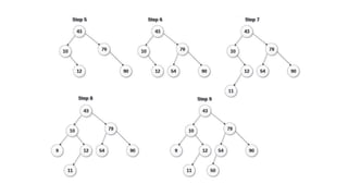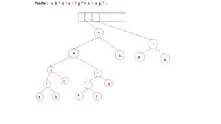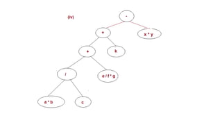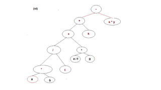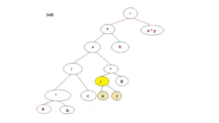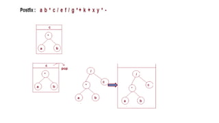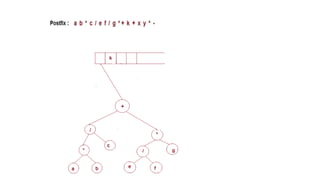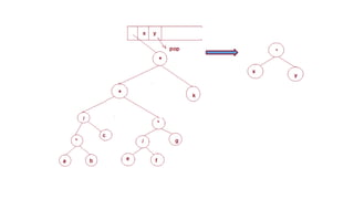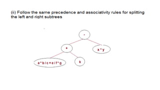 The document discusses the implementation of expression trees and binary search trees (BSTs), outlining their structures, properties, and operations such as evaluation, traversal, insertion, and deletion. It explains how expression trees represent arithmetic expressions and how BSTs maintain sorted order for efficient searching. Additionally, it describes the algorithms for constructing expression trees and performing common BST operations with a focus on time complexity.
