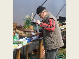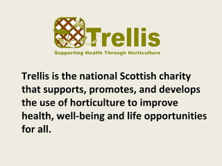 Trellis is a Scottish charity that promotes therapeutic gardening to improve health and well-being. Therapeutic gardening involves using plants and gardening activities, supervised by professionals, to meet clinical goals related to conditions like depression. Research shows gardening provides physical and mental health benefits through activities, social interaction with nature, and sense of purpose. Trellis supports over 200 therapeutic gardening projects across Scotland in various healthcare, education, and community settings.