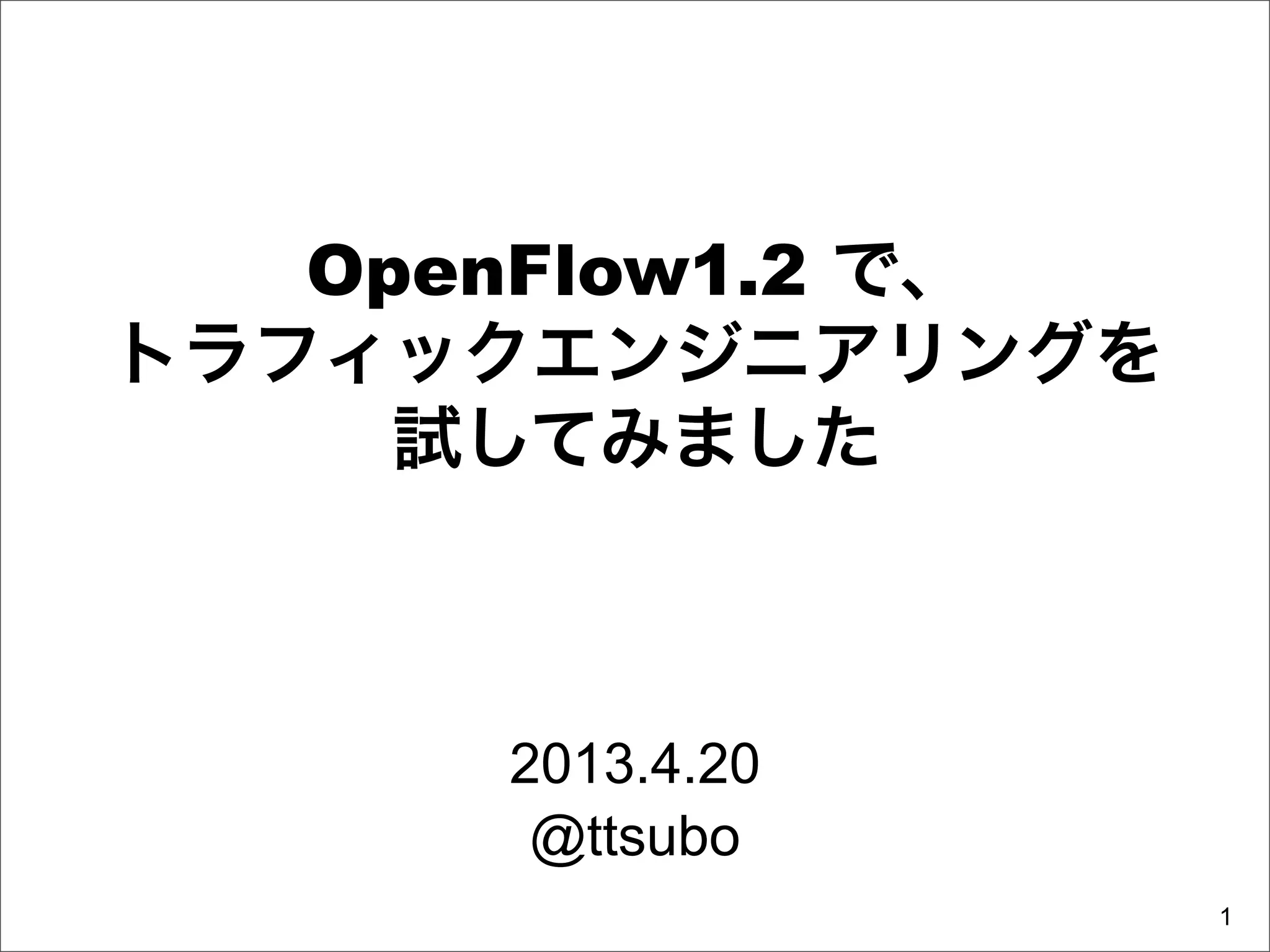 本日、みなさんにお伝えしたいこと。 最近、書籍等でOpenFlowを題材とした記事をよく見かけま すが、そのほとんどが、OpenFlow1.0ベースですよね。 OpenFlow1.1以降では、マルチテーブルなどの新技術が利 用可能となってますが、その活用方法などを入手できる場が ありません。OpenFlow新技術が活用されていない状況は、 もったいないと感じています。 そこで、OpenFlow新技術の活用事例を、みなさんと共有し たくて、OpenFlow1.2のユースケースを試してみました。