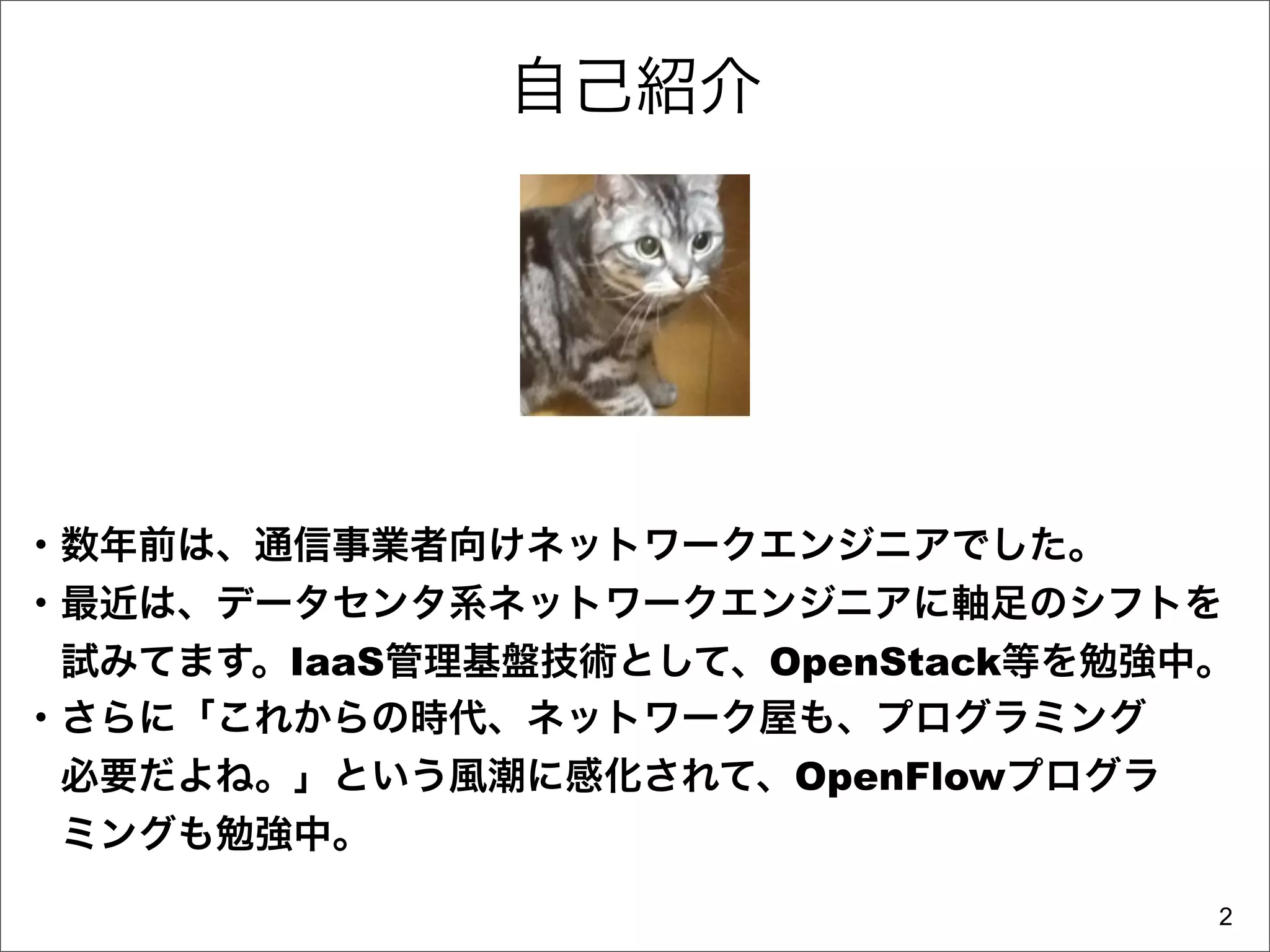 自己紹介 ・数年前は、通信事業者向けネットワークエンジニアでした。 ・最近は、データセンタ系ネットワークエンジニアに軸足のシフトを 試みてます。IaaS管理基盤技術として、OpenStack等を勉強中。 ・さらに「これからの時代、ネットワーク屋も、プログラミング 必要だよね。」という風潮に感化されて、OpenFlowプログラ ミングも勉強中。