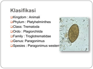 Dokumen tersebut membahas tentang Trematoda Paru bernama Paragonimus westermani. Cacing ini termasuk kelas Trematoda yang menginfeksi paru-paru manusia dan hewan, menyebabkan penyakit Paragonimiasis. Spesies P. westermani merupakan agen penyebab utama infeksi ini.