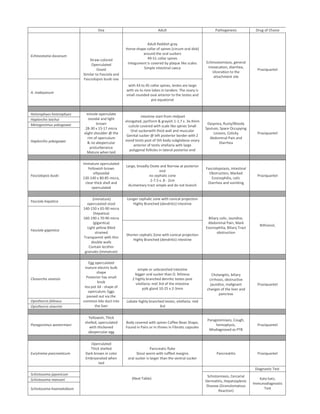 2) It provides a table outlining 14 trematode species, their first and second intermediate hosts, definitive host, and diagnostic stage. A second table provides details on the ova, adult worms, pathogenesis, and drug of choice for each species.