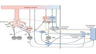 This document discusses the pathophysiology of tremor. It describes tremor as a rhythmic oscillation of a body part that can be characterized by the parts affected, frequency, and amplitude. There are four principles of tremor genesis: mechanical oscillation, reflex activation, central oscillators, and unstable feedforward/feedback loops. Resting tremor in Parkinson's disease involves dysfunction of the basal ganglia and cerebellar circuits. Action tremor has been linked to neurodegeneration in the cerebellum and changes in GABA signaling. Different types of tremors can result from lesions in specific areas like the cerebellum, midbrain, or brainstem.
