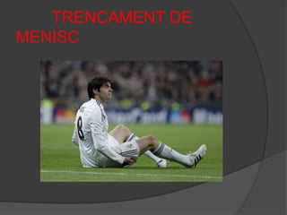 CAUSES DE TRENCAMENTS DE MENISCLa forma mes habitual dels trencaments de menisc son de forma indirecta, rebre un tacle de l’adversari i el genoll realitza un gir brusc, una entrada a la tíbia i el genoll es desplaça.El futbol es un dels esports on hi ha mes meniscs trencats. L’ esqui també destaca ja que es freqüent les enganxades dels esquis.