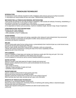 Trenchless technology involves installing underground utilities with minimal surface excavation. It includes trenchless construction methods (TCM) for new installations and trenchless renewal methods (TRM) for rehabilitating existing lines. Key TCM methods include horizontal directional drilling, microtunneling, pipe jacking, auger boring, pipe ramming, and moling. TRM methods include pipe bursting, pipe relining, and localized repair techniques. Trenchless methods reduce social and environmental impacts compared to open-cut trenching.