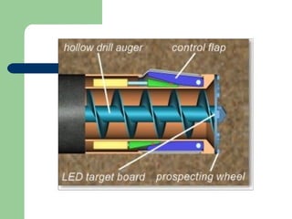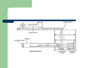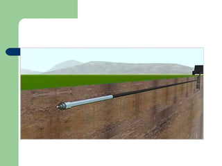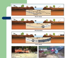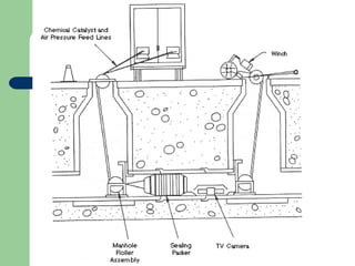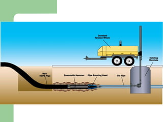 This document discusses trenchless technology methods for installing and rehabilitating underground infrastructure with minimal surface disruption. It describes various trenchless methods for new installation like microtunneling, horizontal directional drilling, and short drive systems. Rehabilitation methods discussed include pipe bursting, pipe eating, cured-in-place lining, slip lining, and localized spot repairs using materials like coatings, cement mortar, resins, and grout. The document outlines advantages such as speed, minimal environmental impact, and ability to install pipes under obstacles like rivers. Trenchless technology is gaining popularity in India for projects installing pipes below rivers and urgent sewer repairs.