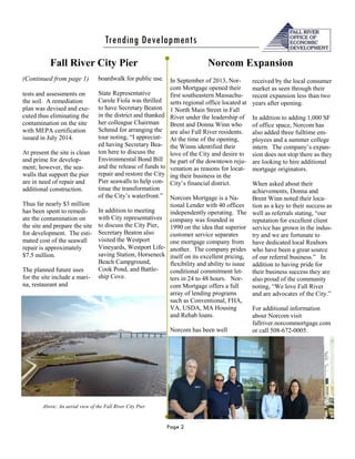 The document summarizes recent economic development activities in Fall River, Massachusetts. It discusses the Secretary of Energy and Environmental Affairs' visit to discuss funding for repairs to the Fall River City Pier. The pier requires $7.5 million in seawall repairs to enable development including a marina, restaurant and boardwalk. It also highlights the expansion of the local Norcom Mortgage office, which has added staff and space since opening in Fall River in 2013. Additionally, it provides data on the colleges recently attended by the top students from local high schools.