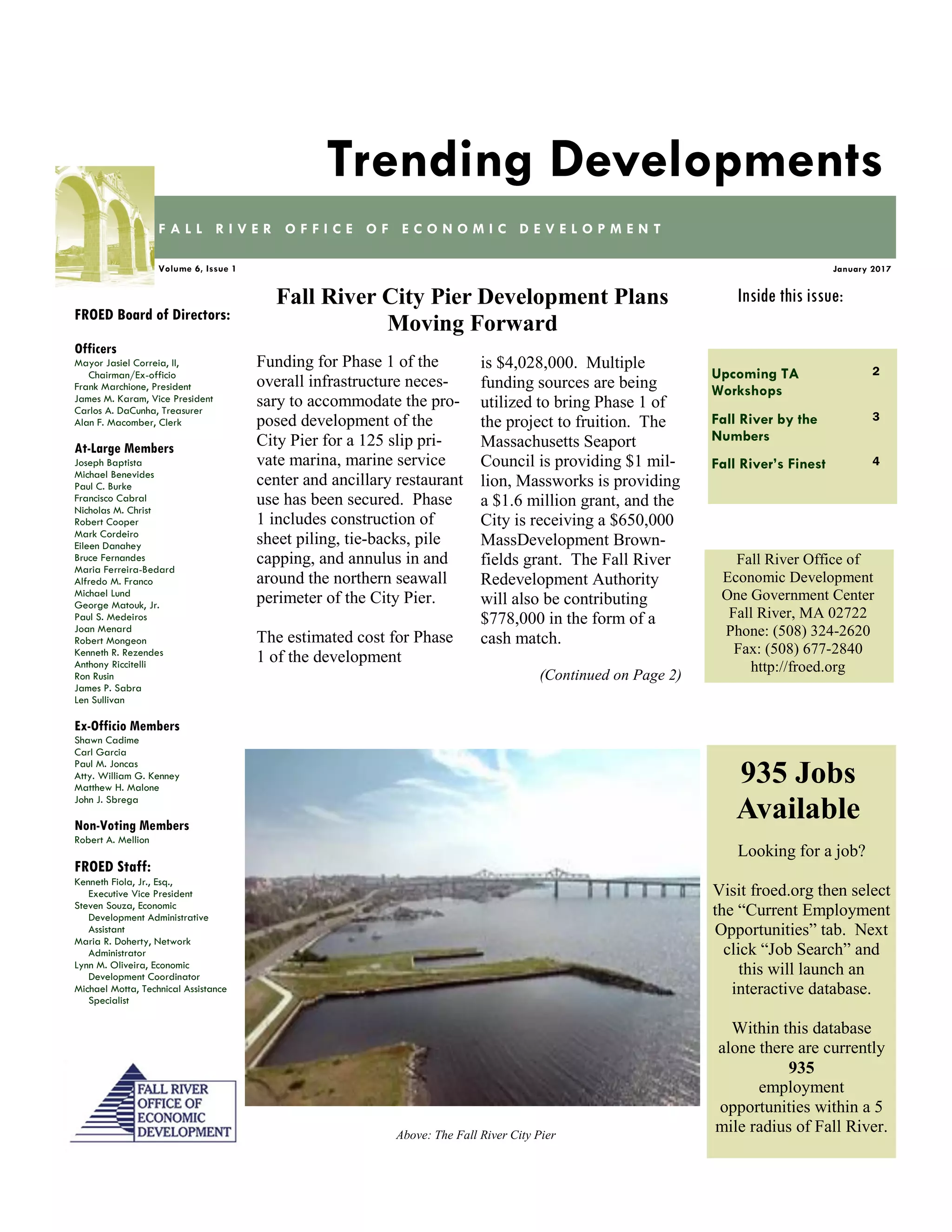 The document discusses upcoming plans and events from the Fall River Office of Economic Development. It summarizes that funding has been secured for Phase 1 of improvements to the Fall River City Pier, including construction of sheet piling and other infrastructure, with an estimated cost of $4 million funded through various state programs. It also announces a free workshop series on starting and growing a business in Fall River, covering topics such as financing, marketing, and customer service. Finally, it profiles John J. Doran, a Medal of Honor recipient from Fall River who displayed bravery during the Spanish-American War.