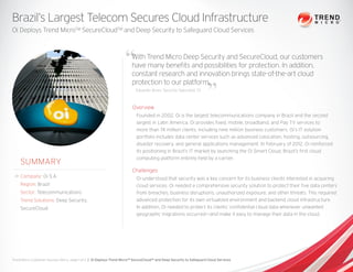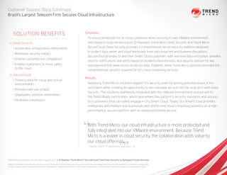 Oi S.A., the largest telecommunications company in Brazil, deployed Trend Micro Deep Security and SecureCloud to protect its cloud infrastructure and the data of its customers. The Trend Micro solutions integrated seamlessly with Oi's VMware environment, provided advanced protection for Oi's virtualized systems and cloud backend, and enabled easy management of customer data. This allowed Oi to offer secure cloud services and gain Trend Ready certification, reassuring customers.
