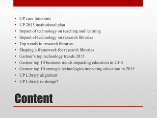 The document provides an environmental scan and analysis of trends that will impact the UP Library from 2015-2025. It discusses the UP's strategic plan and core functions of teaching, learning, and research. It also summarizes key impacts of technology on teaching/learning and research libraries, including increased use of blended learning, mobile apps, electronic publishing, and open educational resources. Top trends in research libraries include emphasis on data management, mobile content, and the evolving scholarly record. The document outlines challenges around digital literacy, personalization, and embracing radical change to integrate new technologies.