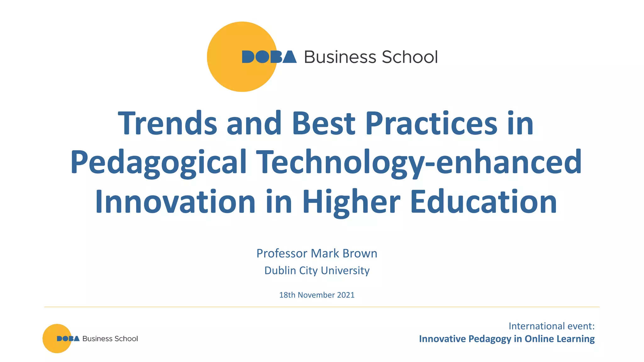 This document summarizes a presentation on innovative pedagogy in online learning. The presentation covered trends in online learning including the growth of education technology investments, convergence of learning modalities, and a changing credential ecology with the rise of micro-credentials. It discussed challenges with old models of technology-enhanced learning and competing narratives around education's digital future. The presentation concluded with thanks in both English and Irish.