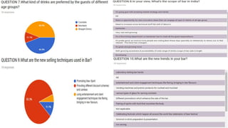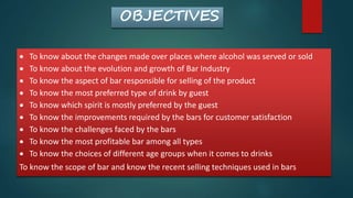 The document discusses trends in bars based on a survey conducted. It finds that ambience is the most important aspect for enhancing sales, and that straight drinks and cocktails are most popular. Whiskey is the most preferred spirit. Most believe improvements in service style could help bars, and handling large crowds is a key challenge. Bars with live bands are seen as most profitable currently. Younger guests prefer cocktails while discounts and combos are effective new selling techniques. Molecular mixology and different service styles are growing trends in the bar industry.