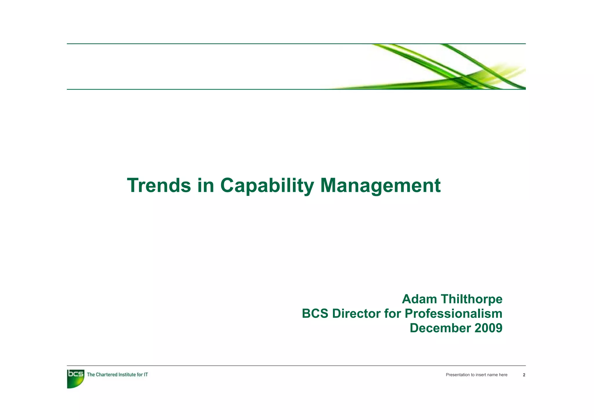 This document summarizes a presentation given by Adam Thilthorpep on trends in capability management. The presentation discusses how capability management can help organizations balance current and future needs by developing their workforce. It also notes challenges for capability management like skills shortages and changing employee demands. The presentation emphasizes that capability management is important for maximizing innovation and meeting business goals with qualified IT professionals.