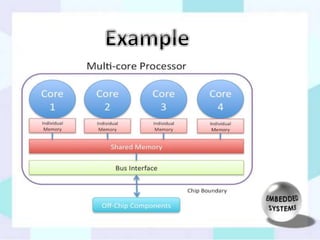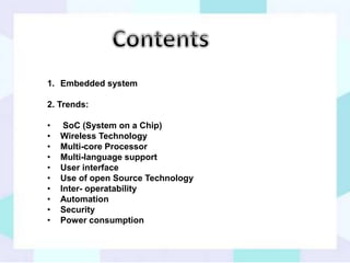 This document discusses trends in embedded systems. It outlines that embedded systems integrate computer hardware and software onto a single microprocessor board. Key trends in embedded systems include systems-on-a-chip (SoC), wireless technology, multi-core processors, support for multiple languages, improved user interfaces, use of open source technologies, interoperability, automation, enhanced security, and reduced power consumption. SoCs integrate all system components onto a single chip to reduce power usage. Wireless connectivity and multi-core processors improve performance. Embedded systems also support multiple languages and have improved user interfaces.