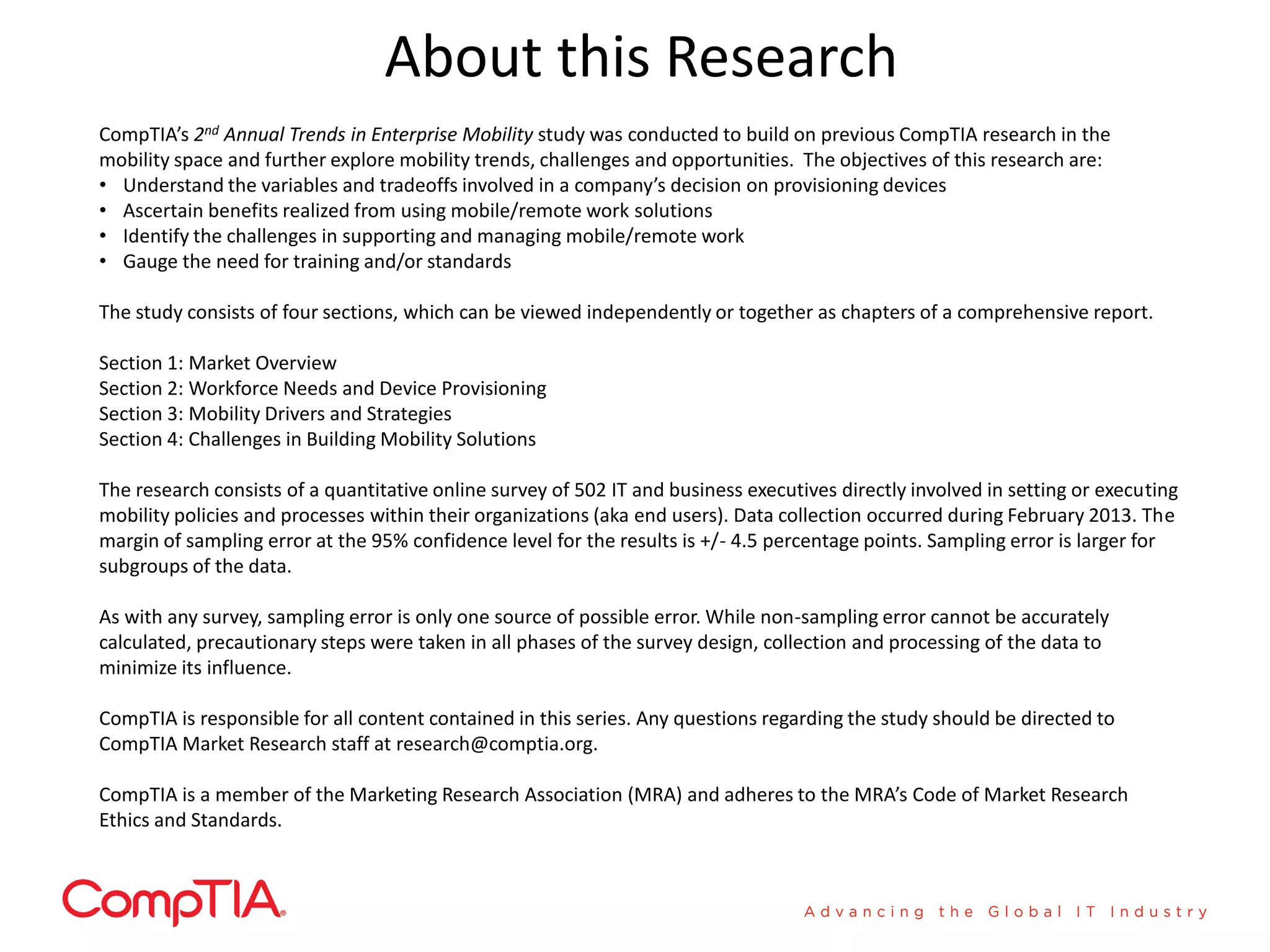 The document summarizes the findings of CompTIA's 2013 study on enterprise mobility trends. Some key findings include: