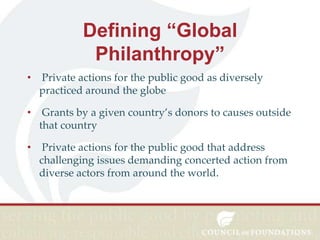 This document discusses trends in U.S.-based global grantmaking. It defines global philanthropy and outlines how U.S. foundations make grants globally, directly to overseas organizations or through U.S.-based intermediaries. Quantitative data shows that international giving by U.S. foundations has grown significantly since 1970 and especially since 1998. Qualitative trends include the influence of globalization, a focus on results and impact, and greater involvement of West Coast foundations in global issues.