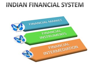The document discusses India's financial system, including money markets, capital markets, and financial intermediation. It describes key components of the money market like treasury bills, commercial papers, and call/notice money. The capital market deals in longer term instruments like stocks, bonds, and hybrid instruments. Financial intermediaries like banks, brokers, and investment banks facilitate the flow of funds between savers and borrowers. The system has grown significantly since the nationalization of banks and liberalization of the economy.