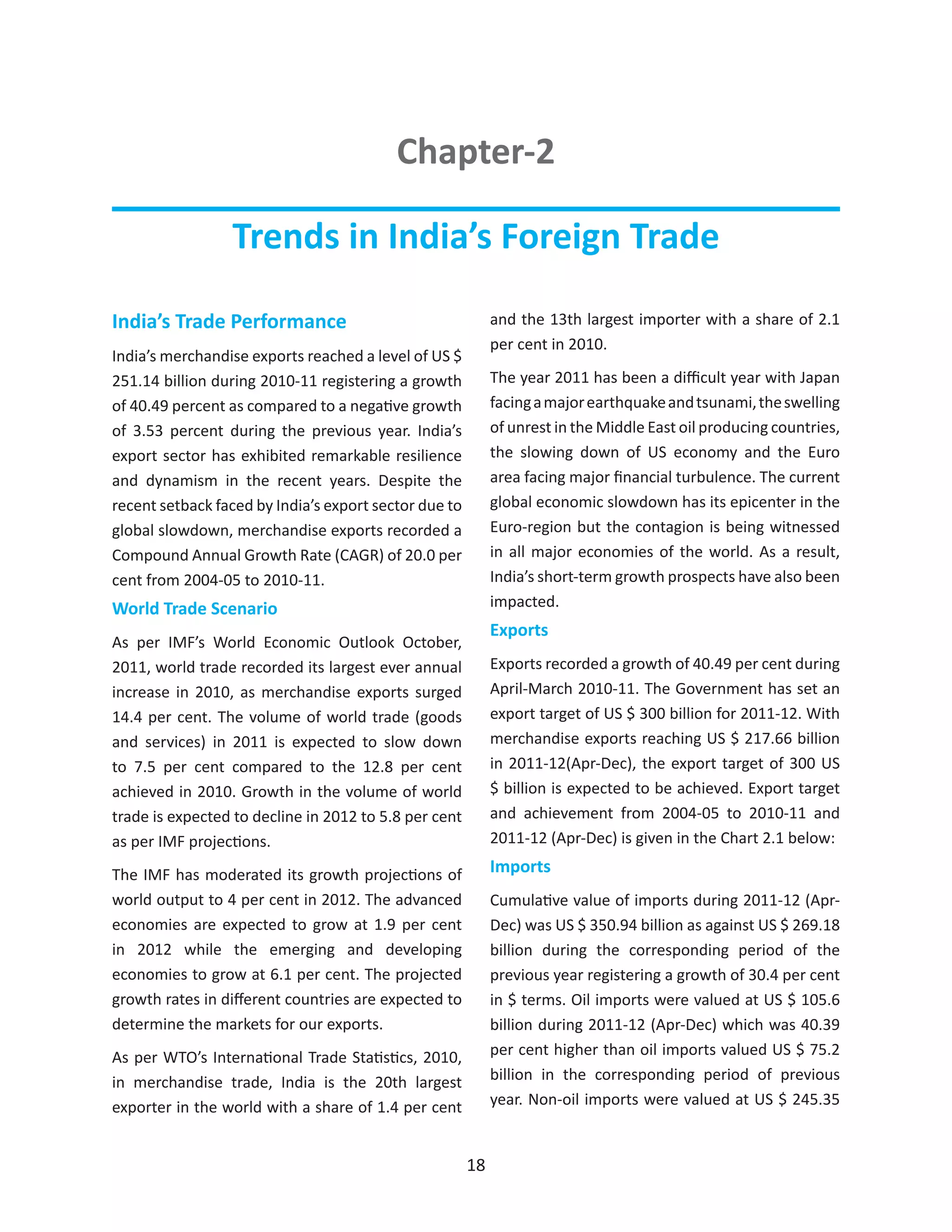 This document summarizes India's foreign trade performance and trends from 2004-2005 to 2011-2012. It notes that India's merchandise exports reached $251 billion in 2010-2011, registering 40% growth. However, the global economic slowdown has impacted India's short-term growth prospects. Exports grew 40% in 2010-2011 while imports grew 30% in 2011-2012. The trade deficit widened to $133 billion in 2011-2012 compared to $96 billion the previous year. The top five export commodities accounted for over 53% of total exports led by petroleum products, gems and jewelry, and machinery.