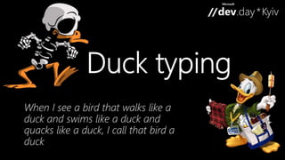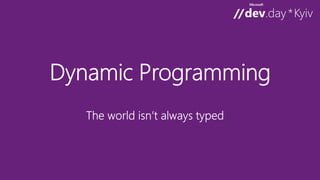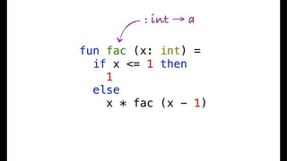 This document discusses trends in programming languages, including dynamic vs static languages. It covers concepts like implicit typing, metaprogramming, performance, and scaling. Functional programming concepts are mentioned, like first-class functions, immutable data, and referential transparency. Specific languages mentioned include Lisp, Smalltalk, C, Java, C++, C#, Scheme, Haskell, C#, F#, JavaScript, C++11, and Visual Basic. Type inference is discussed at the local and global level. The document promotes the use of the F# language for its functional programming capabilities.
