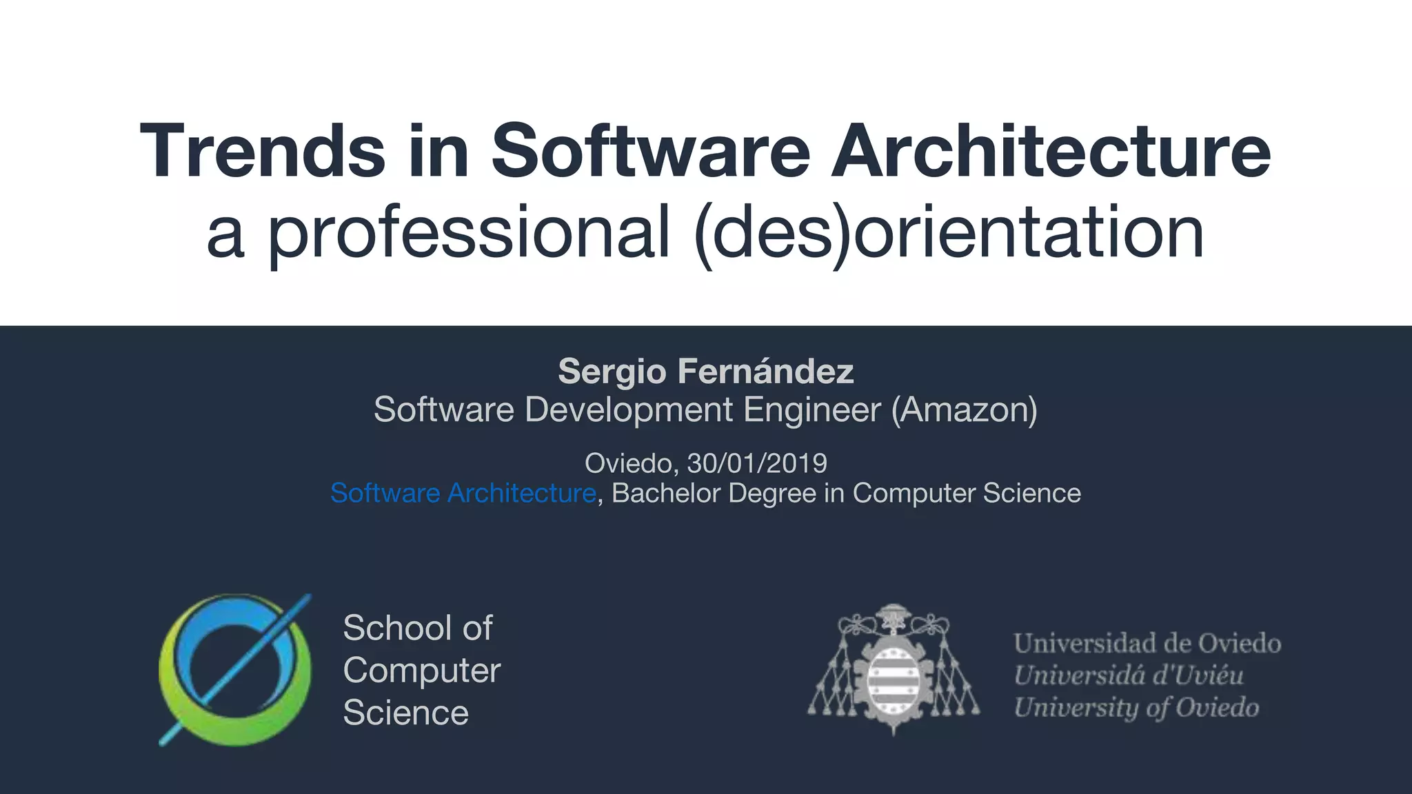 The document outlines a presentation by Sergio Fernández on trends in software architecture, highlighting his background and current role at Amazon. It covers essential topics like software architecture definitions, evolving scales of software systems, and the complexities involved in stateful versus stateless services. Additionally, the document discusses career opportunities for software architects and provides an overview of a lab assignment to create a decentralized chat application.