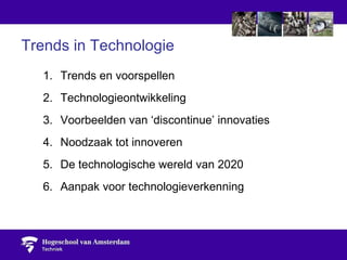 Trends in TechnologieTrends en voorspellen Technologieontwikkeling Voorbeelden van ‘discontinue’ innovaties Noodzaak tot innoveren De technologische wereld van 2020 Aanpak voor technologieverkenning