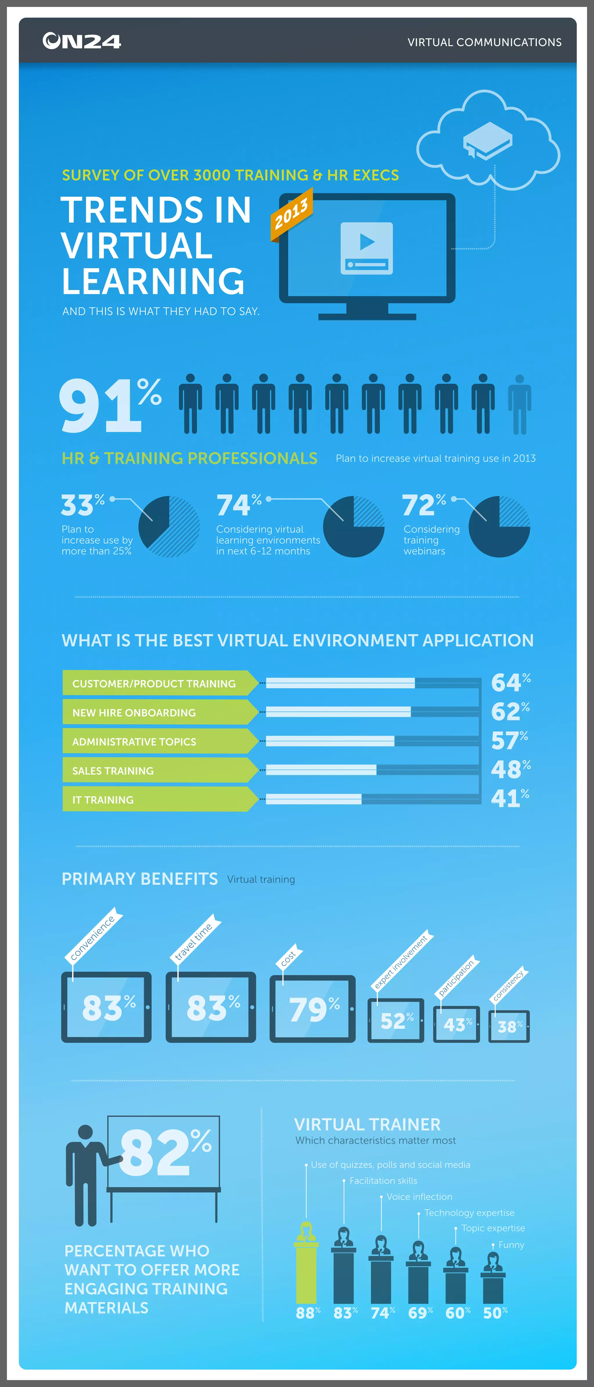 A survey of over 3000 training and HR executives found that 91% plan to increase their use of virtual training in 2013, with 33% expecting an increase of over 25%. The top virtual learning environments cited were customer/product training (64%), new hire onboarding (62%), and administrative topics (57%). The primary benefits of virtual training were seen as convenience, cost savings in travel and time, and the ability to involve more participants. Most respondents wanted to offer more engaging training materials.