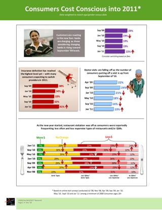 The document provides insights into various consumer trends observed in December 2010, highlighting cost-conscious consumer behaviors impacting banking, travel, health care, and dining. It reports on the increasing prevalence of advertising fatigue and concerns regarding health impacts from food and beverages, alongside changing family dynamics and housing sentiments. Additionally, the document notes a decline in traditional media consumption and insights on holiday shopping behaviors.