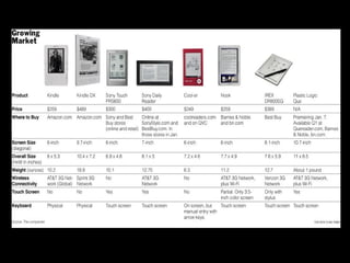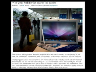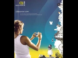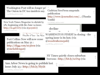 This document discusses trends in information consumption and production. It notes the rise of digital formats and mobile access to information. Photos and quotes are provided on topics like e-books, smartphones, augmented reality, hyperlocal information, and challenges for print media. The role of libraries is discussed in relation to shifting from a focus on books and information toward community engagement and experiences.