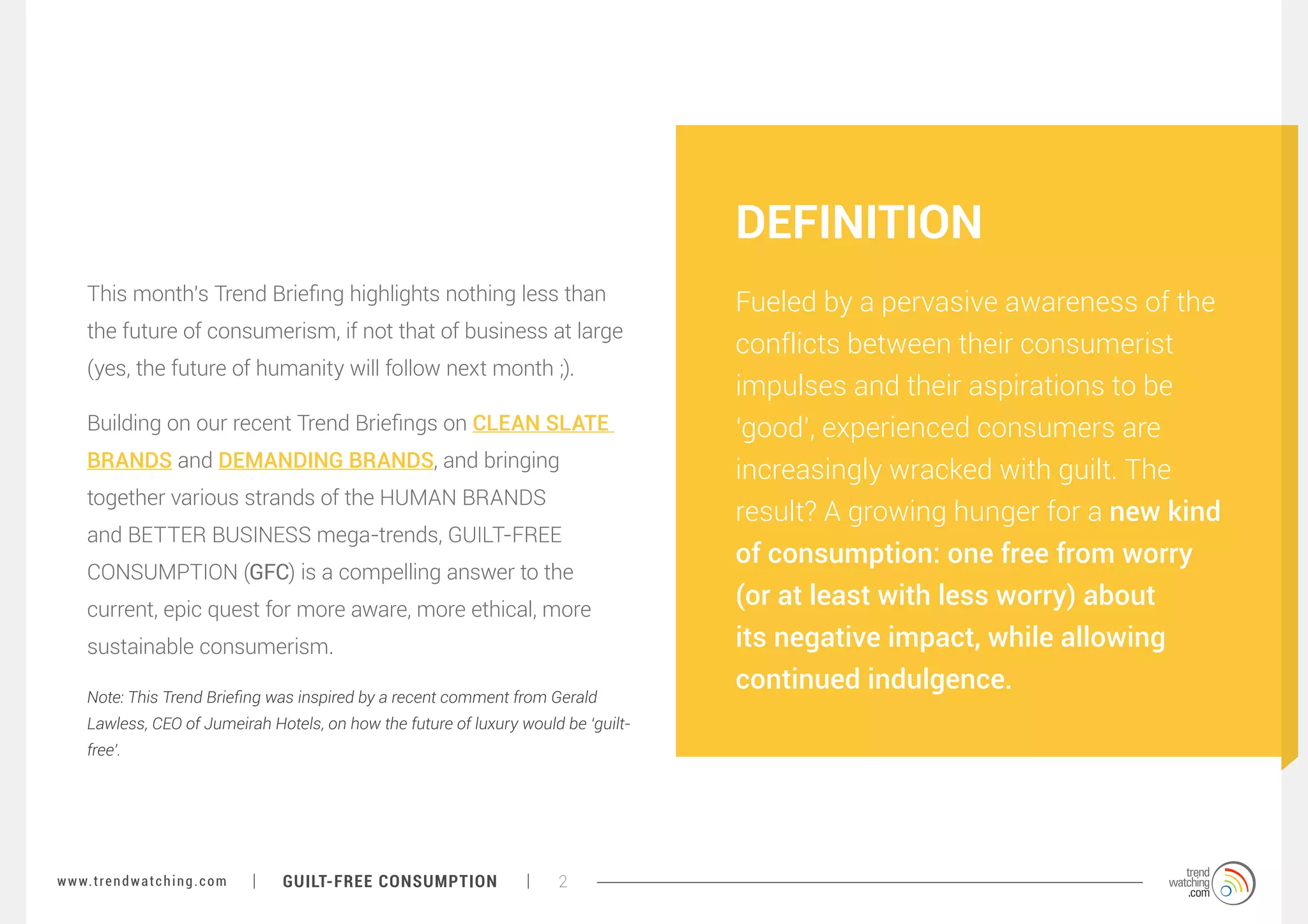 The November 2013 trend briefing by Trendwatching.com explores the concept of guilt-free consumption (GFC) as a response to consumers' increasing awareness of the ethical and environmental implications of their purchases. It emphasizes the shift towards a consumption model that alleviates feelings of guilt related to personal, societal, and planetary impacts, highlighting strategies for brands to cater to these aspirations. The document suggests that successful brands will engage consumers by addressing the various types of guilt and offering innovative, guilt-reducing solutions that align with consumers' desires for more sustainable and responsible consumption.