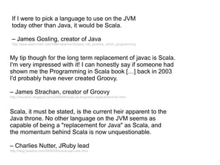 The document discusses Scala as a preferred programming language on the JVM, highlighting its capabilities as a replacement for Java. It covers various Scala features such as syntax, pattern matching, functional programming, and interoperability with Java and .NET. The document also mentions the benefits of Scala, including support for both object-oriented and functional programming paradigms, and emphasizes its growing adoption in modern programming practices.