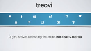 The document discusses the transformation of the online hospitality market by digital natives, highlighting the decline in traditional travel agency effectiveness and the rise of alternatives like OTAs and forums. It emphasizes the digital native's behavior in seeking and sharing information through various apps and social networks while traveling, reflecting a shift towards a more interactive travel experience. The Treovi platform aims to enhance user engagement and streamline the booking process without commissions or fees.