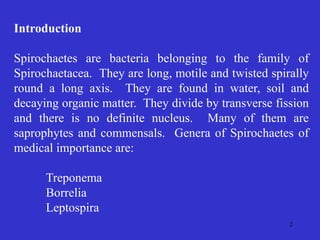 Treponema are spiral shaped bacteria that can cause diseases like syphilis. Treponema pallidum specifically causes syphilis, which has three stages - primary, secondary, and tertiary syphilis. Primary syphilis involves a sore called a chancre, secondary syphilis has rashes and skin lesions, and tertiary syphilis can involve damage to internal organs. Syphilis is diagnosed through microscopic examination of samples or serological tests that detect antibodies against Treponema, with tests like the RPR and FTA-ABS.