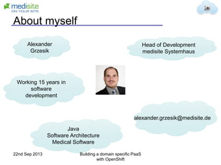 The document outlines the development of a domain-specific Platform as a Service (PaaS) called Tresor, which uses OpenShift to provide a secure and flexible cloud environment for healthcare applications. It discusses the project's goals, customization options, and integration capabilities with other services, while highlighting importance of data security in the healthcare sector. The Tresor PaaS is seen as a certified solution for managing sensitive medical records, with plans for its implementation in hospitals by 2015.