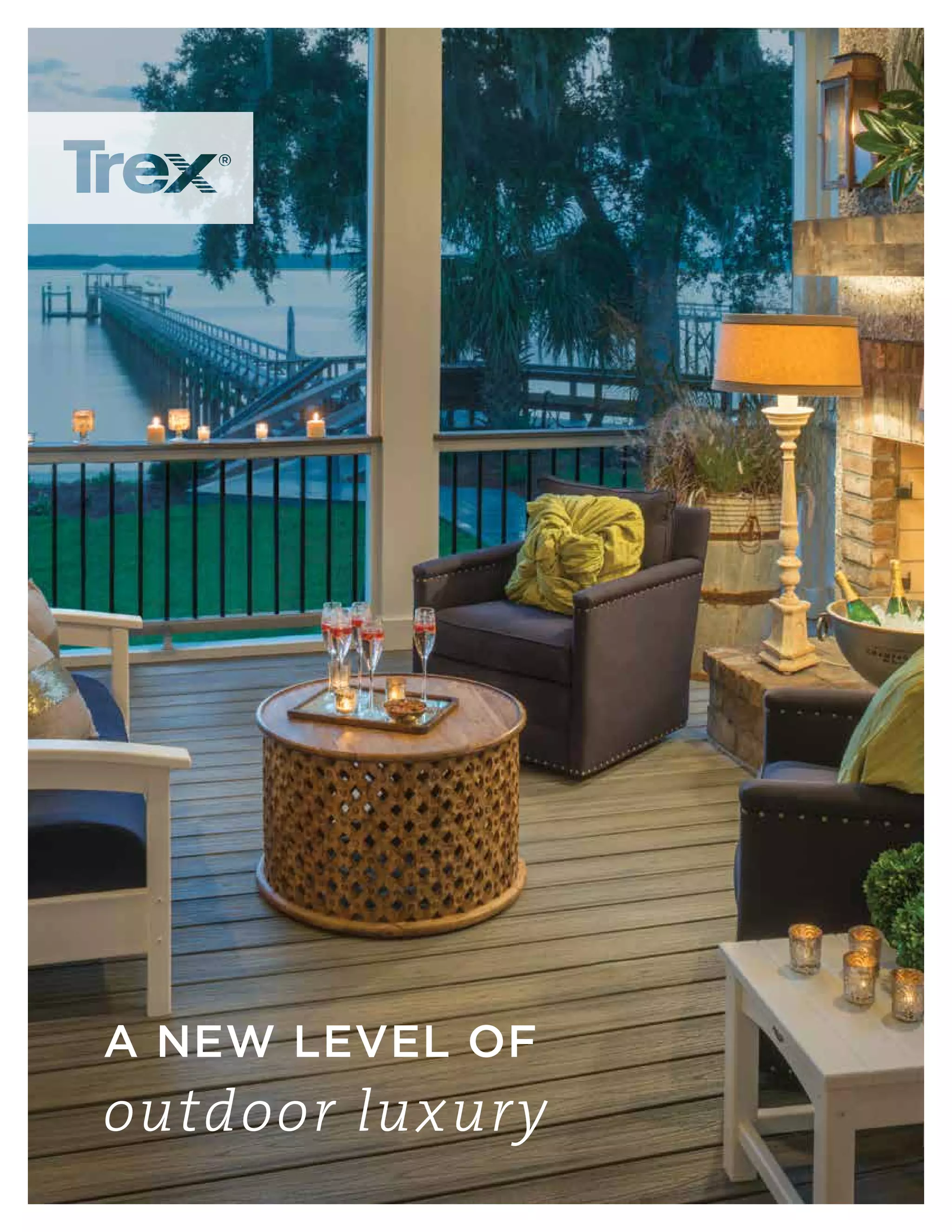 This document provides information about Trex decking and railing products. It highlights features like Trex's use of recycled materials, low maintenance finishes that resist fading and staining, and hidden fastening systems. The document includes photos showcasing Trex decking, railing, lighting and other outdoor living products. It also briefly describes collaborations between Trex and designers to showcase deck designs.