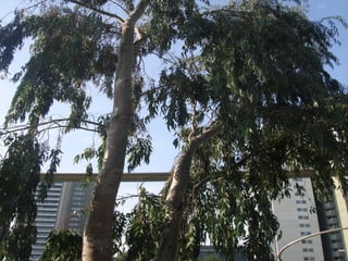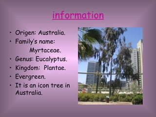 Eucalyptus camaldulensis is an evergreen tree native to Australia that grows rapidly and provides good shade. It plays an important role in stabilizing river banks and is strong against cold weather and rain. It has been widely planted in places like Argentina, Spain, and Brazil. The leaves are evergreen, dark green, and fragrant. The flowers bloom from April to June and are protected. The woody fruits have valves that open to release seeds. The thick trunk can be various colors. The bark is soft, smooth, and sheds annually. The wood makes good charcoal and sleepers, and the plant is used for beekeeping and firewood.