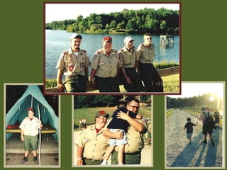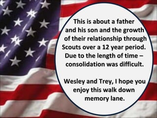This presentation honors Wesley Gormus Jr. and his son Wesley Gormus III (Trey) for their accomplishments in the Scouting program over 12 years. It describes their involvement starting in Cub Scouts in 1996 with Wesley as Trey's den leader, and then their progression to Boy Scouts together, including camps, activities, and leadership roles over the years until Trey received his Eagle Scout award. The document celebrates the growth of their relationship and Trey's love of the outdoors fostered through Scouting.