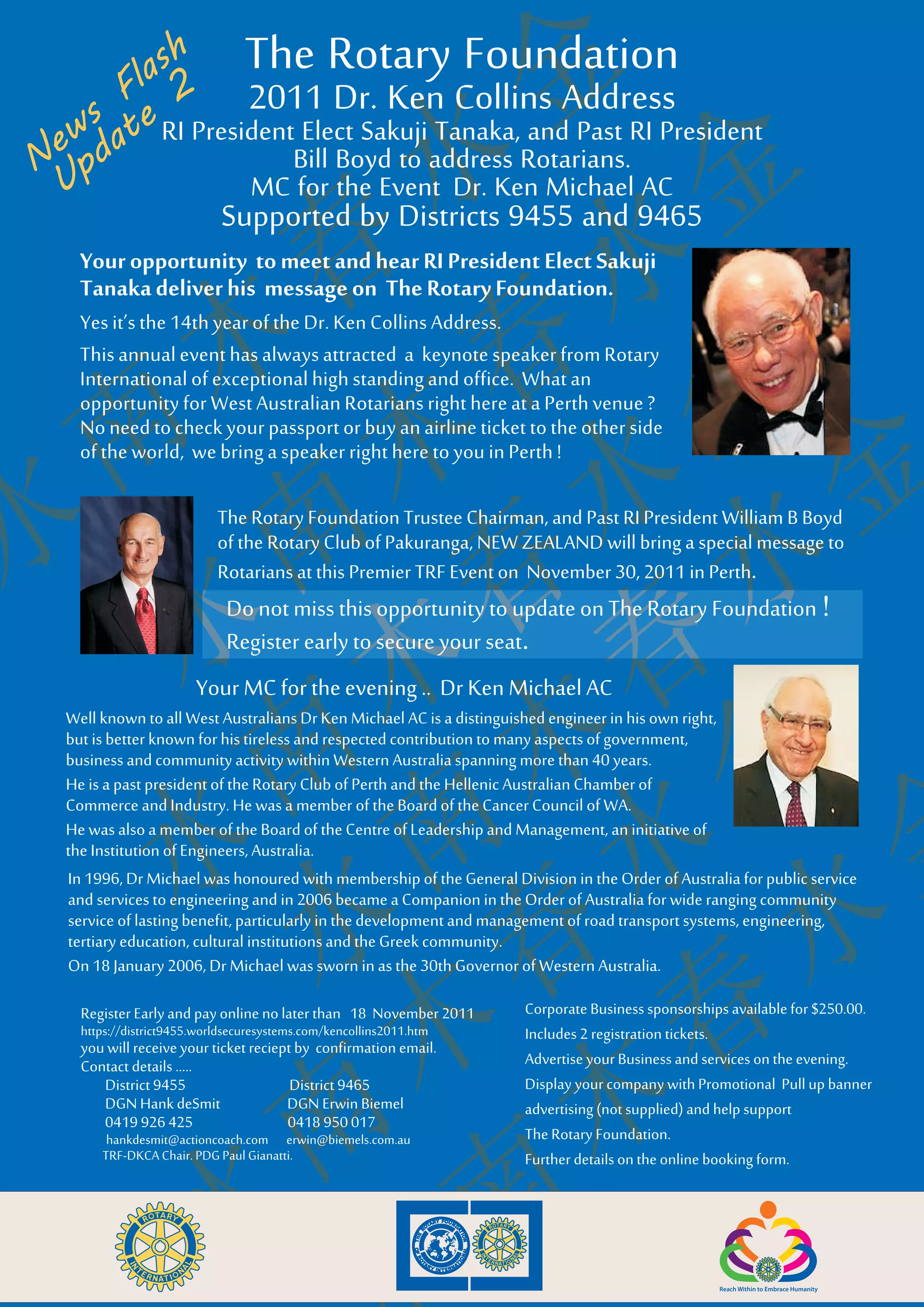 This document announces an event to hear presentations from Rotary International leaders on The Rotary Foundation. It will take place on November 30, 2011 in Perth, Australia, featuring RI President-Elect Sakuji Tanaka and Past RI President William B Boyd. Dr. Ken Michael AC will serve as the master of ceremonies. Attendees will have the opportunity to learn about TRF programs and support its initiatives through sponsorships or display advertising at the event.