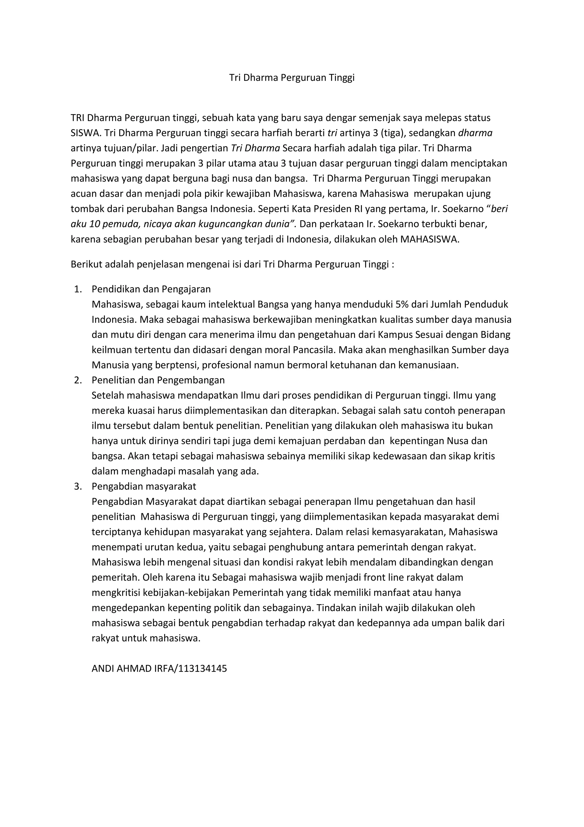 Tri Dharma Perguruan Tinggi terdiri dari tiga pilar utama yang bertujuan untuk menciptakan mahasiswa yang bermanfaat bagi nusa dan bangsa, yaitu pendidikan, penelitian, dan pengabdian masyarakat. Mahasiswa diharapkan dapat meningkatkan kualitas diri dan sumber daya manusia dengan penerapan ilmu yang mereka peroleh serta menjadi penghubung antara pemerintah dan masyarakat. Sebagai agen perubahan, mahasiswa memiliki tanggung jawab untuk mengkritisi kebijakan demi kesejahteraan rakyat.