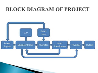 This document describes a project to design a Triac-based automatic voltage stabilizer. The stabilizer will automatically maintain a required voltage level and protect equipment from problems caused by power fluctuations. It will provide steady voltage for devices like refrigerators using a microcontroller and Triacs, which allow for faster response times and silent operation compared to relay-based stabilizers. The stabilizer is intended to resolve issues with low and unstable voltages in Pakistan by regulating voltage levels for home and industrial devices.
