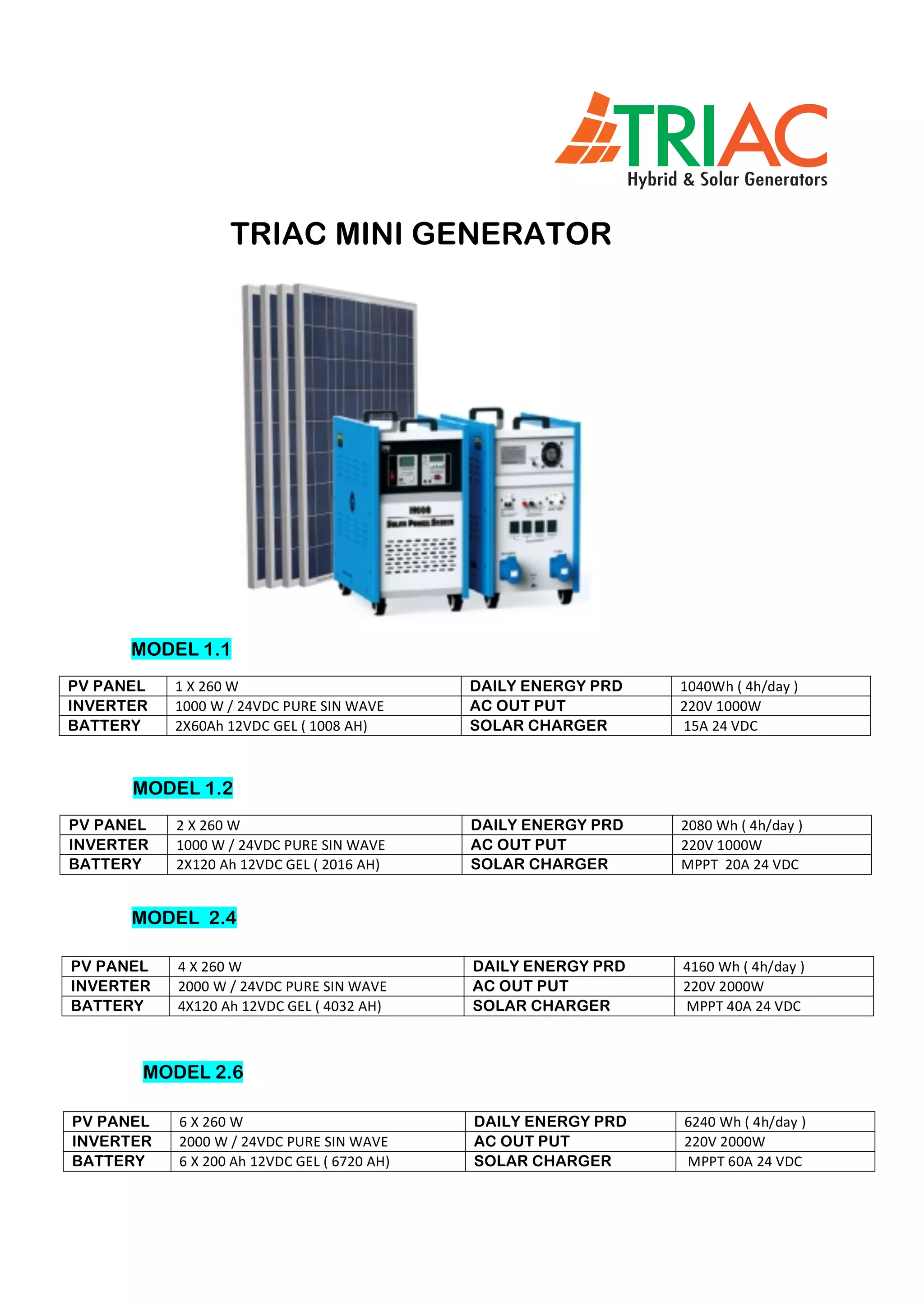 This document outlines specifications for 4 mini generator models from TRIAC. Model 1.2 uses 1 260W solar panel, a 1000W inverter, and 2 60Ah batteries. Model 2.4 uses 2 260W solar panels, a 1000W inverter, and 2 120Ah batteries. Model 2.6 uses 4 260W solar panels, a 2000W inverter, and 4 120Ah batteries. Model 1.1 is the largest, using 6 260W solar panels, a 2000W inverter, and 6 200Ah batteries. All models use a pure sine wave inverter and gel batteries, with solar charging via either 15A, 20A, or 40A/60A MPPT controllers depending on the model