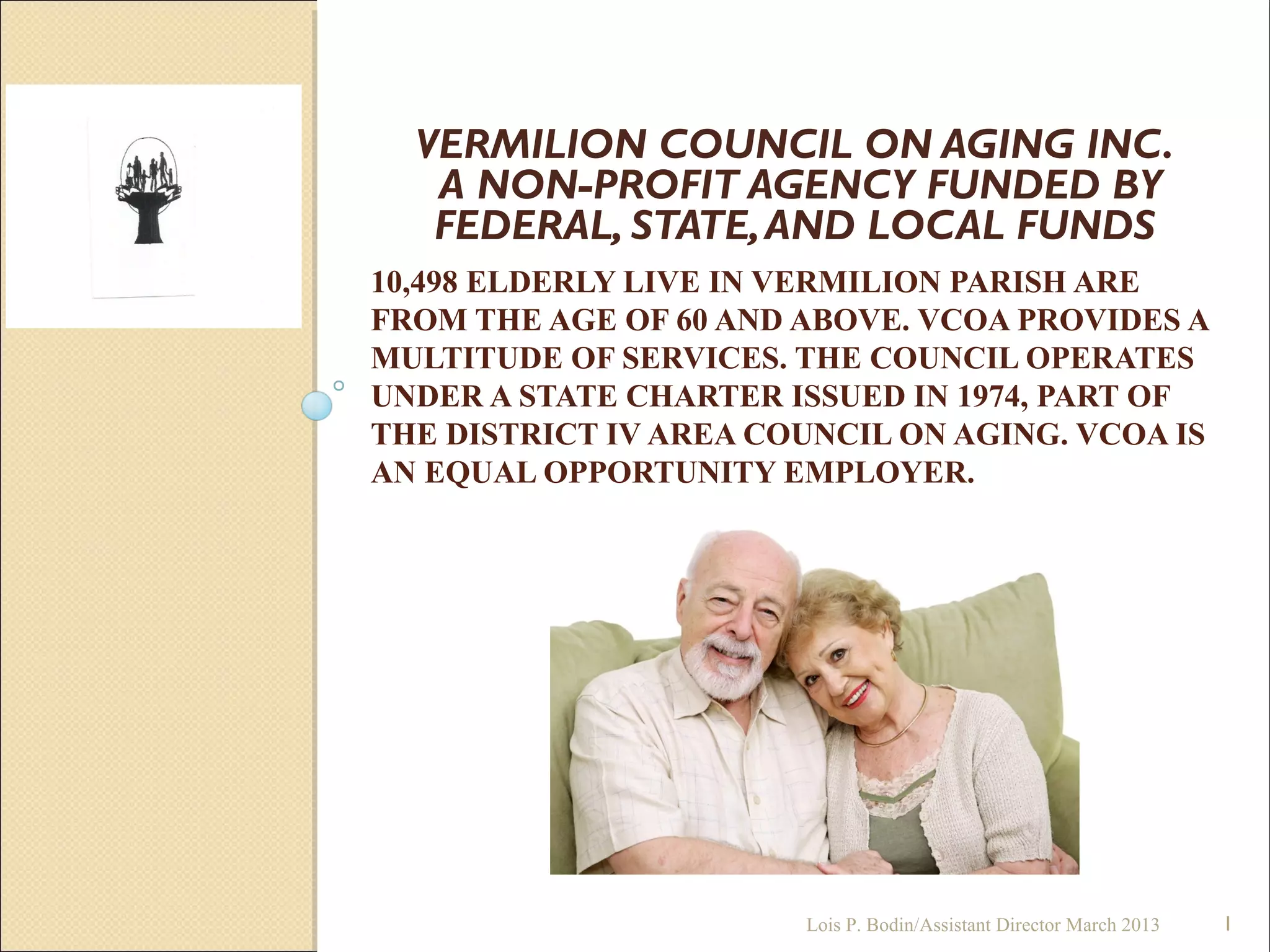 10,498 elderly individuals over age 60 live in Vermilion Parish. The Vermilion Council on Aging (VCOA) provides many services to this population, including congregate and home delivered meals, transportation, homemaker services, respite care, and more. VCOA operates on funding from federal, state, and local sources and has been serving the community since 1974.