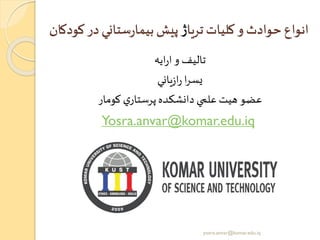با اطفالتریاژ ✓تریاژپرستار ایرب بفردیمنحصر چالش کودکانبیندر انور واعصابهای فوریتمی ایجاد کند. ✓شامل مختلفی عالیم باانربیما: ی خودکشافکار ،هذیان ،،توهم انوییارپا ،ایمبارزه یا تهاجمیفتارر/سای ،ی کش آدمحاد زکو در بایدکه ،دهند نشاناست ممکنار خطرباالیجاترد یاررق بی وابر،اضطدوسطح بگیرنداررق ی انسژراوشدتشاخص. ✓یافمانزساغیر های توهم و هذیانهای ،نیانتاسیورا دیس ،نکنفوزیو با کودکی هردر باید ته دوسطحبگیرنداررق ی انسژراوشدت شاخص. yosra.anvar@komar.edu.iq