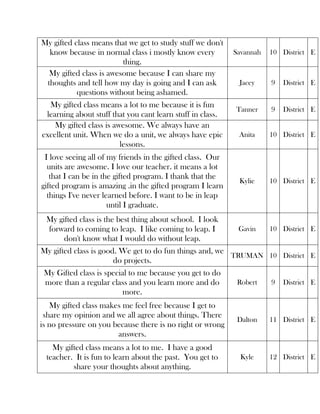 The student enjoys their gifted class because they get to learn new things not covered in regular classes. They like being able to share their thoughts and ask questions without feeling ashamed. The gifted class is fun and means a lot to the student because they can learn things they cannot in other classes. They look forward to coming to their gifted class and appreciate being part of the gifted program.