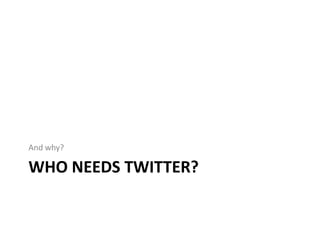 3. The document then covers potential benefits of Twitter for informal learning, social networking, and engaging discussions, but also notes it could be "too good" due to its addictive nature and how it may discourage deep work or focus.