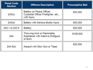 The document outlines the typical criminal trial process from arrest through appeal. It begins with an arrest, followed by booking and bail being set. The defendant then has an arraignment where they learn the charges and enter a plea. Next steps include preliminary hearings, grand jury proceedings, plea bargaining or preparation for trial. The process concludes with a jury verdict, sentencing, and the option to appeal the verdict.