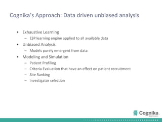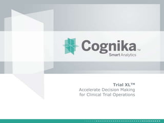Cognika's Trial XL uses machine learning to analyze clinical trial data and provide insights to improve trial operations. It profiles investigators and sites, evaluates criteria that impact recruitment and outcomes, and ranks investigators. Case studies showed it identified criteria impacting recruitment, better accrual estimates, and new investigators, helping reduce delays. Trial XL leverages all past learning, applies analytics to extract insights, and accelerates decision making for clinical trials.
